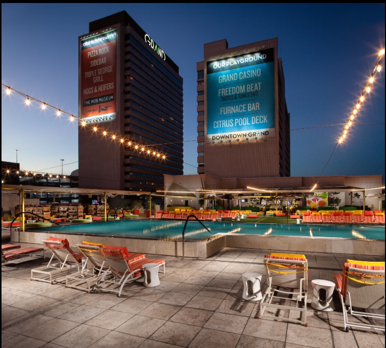Награжденный в 2019 году сертификатом TripAdvisor® и премией AAA Inspector's Best of Housekeeping Award 2020, отель Downtown Grand Hotel & Casino является уникальным центром гостеприимства и развлечений в самом сердце оживленного центра Лас-Вегаса. Расположенный на 3-й улице между Огденом и Стюартом, Downtown Grand охватывает целый городской квартал с отелями, казино и ресторанами. С открытием третьей башни отеля в сентябре 2020 года, отель представляет собой восьмиэтажную, 18-этажную и 25-этажную башню, примыкающую к пешеходному мосту, возвышающемуся над 3-й улицей, с 1114 номерами и сьютами, предлагающими роскошные номера, которые устанавливают новый стандарт изысканности и стиля в Даунтаун Лас-Вегас. Казино Downtown Grand предлагает 25 000 квадратных футов игрового пространства с самыми горячими игровыми автоматами, настольными играми и полнофункциональной спортивной книгой на базе William Hill. Рестораны, бары и развлекательные заведения включают Freedom Beat, печной бар, арт-бар, боковой бар, выставочный зал Spare Room и удостоенный наград стейк-хаус Las Vegas Triple George Grill. Партнерские помещения включают знаменитый салон Hogs & Heifers и Pizza Rock, известный как один из лучших пиццерийных ресторанов города. В центре Гранд есть палуба Citrus Grand Pool Deck, бассейн на крыше с более чем 35 000 квадратных футов развлечений и специальных мероприятий, переливной бассейн, ресторан и бар, полу-частные кабаны, каминная яма и травяная зона отдыха.