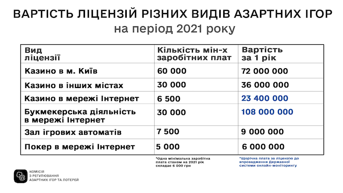 Найдорожче доведеться сплатити саме за букмекерську діяльність – 108 млн грн за рік та казино у Києві – 72 млн грн за рік.